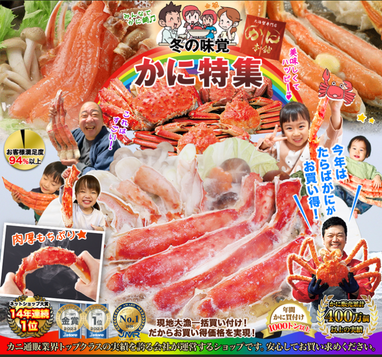 【かに本舗】通販店『匠本舗』は、日本最大級のかに通販量を誇り、おかげさまで**ネットショップ大賞14年連続1位受賞**、そして**かに通販人気No.1ショップ**に選ばれています(日本マーケティングリサーチ機構調べ)。